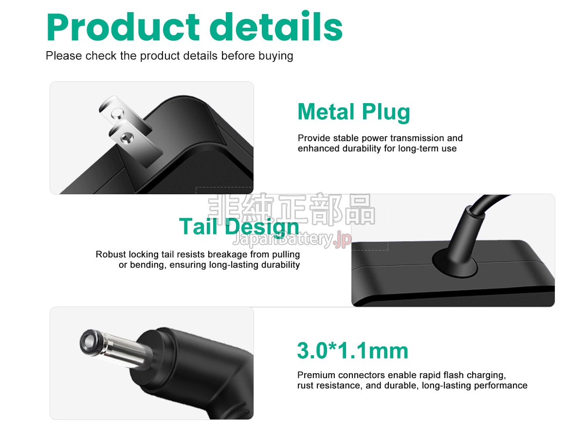 JapanBattery.jpで売り出すアダプターは皆質の高い代替品です。関連した商標やブランドは元の登録者に属します。言及されたブランドや型番は互換性を説明するためのみ。製品に何か満足できないところがあったら、オンラインやメールで連絡して、こちらは24時間内返答します。お客様に100%満足させるのが目標です。