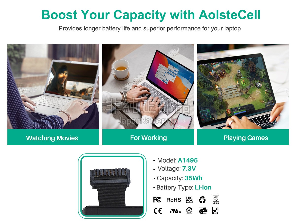 より高い標準で製品を検査します。Apple MacBook Air Core I7 1.7GHZ 11.6 inch A1465(EMC 2631)交換バッテリーは今日本PSE、欧州連合RoHS、CE、アメリカFCC、MSDSに認証されました。