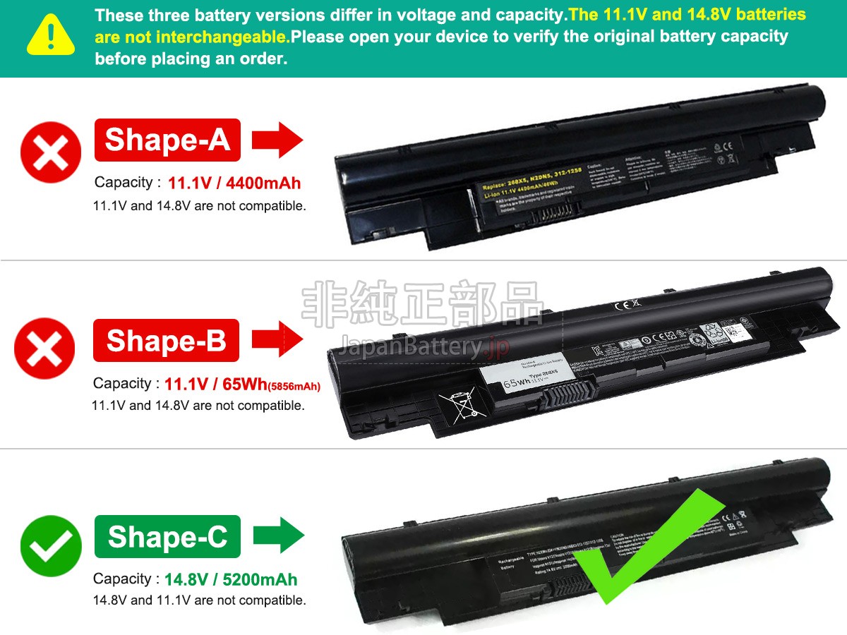 ご安心に購入するために、JapanBattery.jpはすべてのお客様に一流の製品とアフターケアを提供し、購入する前にいくつの問題を注意しております。1、自分に必要のはDell 268X5バッテリーであること、過ちを防ぐため、ご注文時の型番を付記し、正しい電池を購入したかどうかを判断することができる。