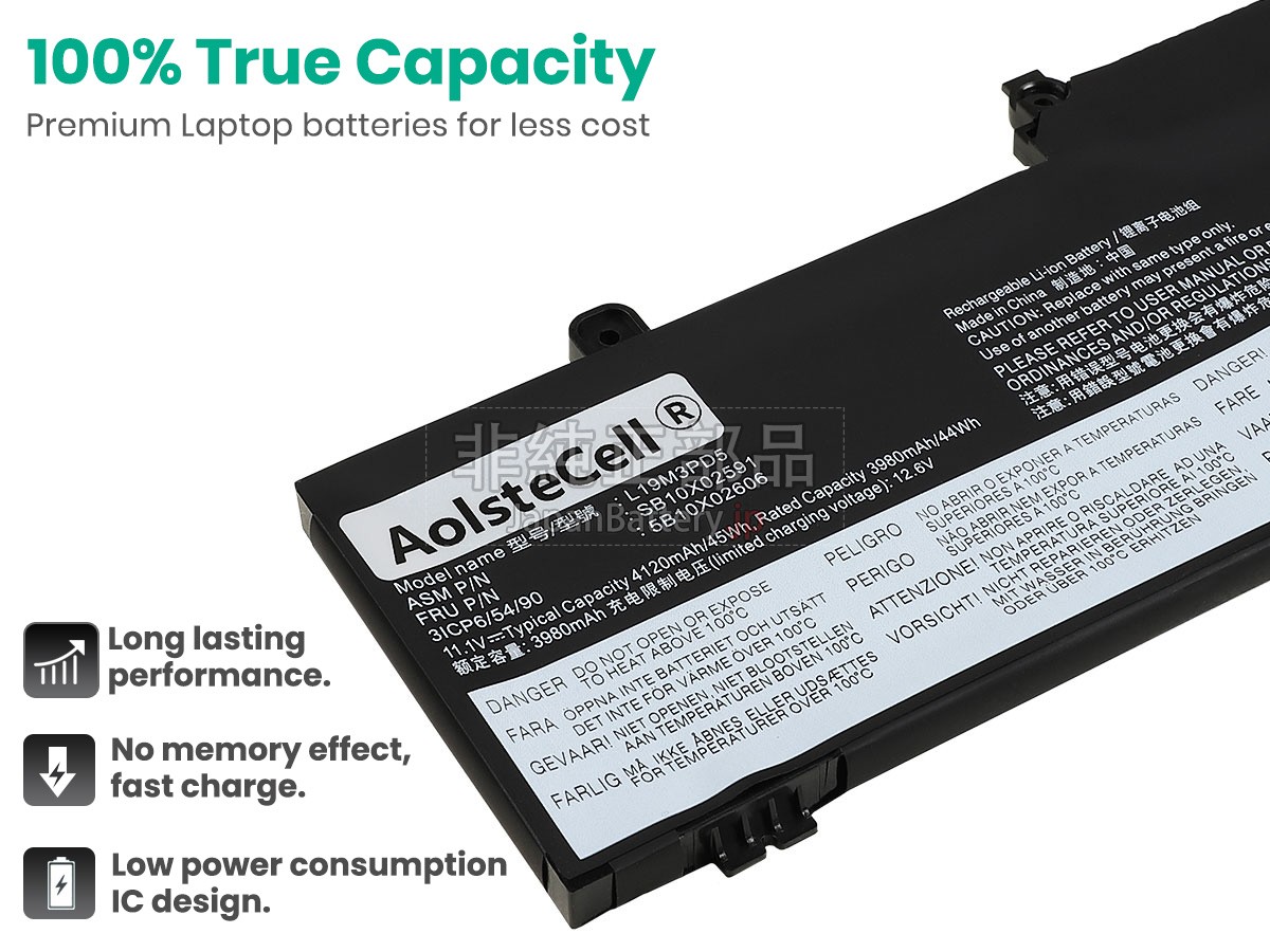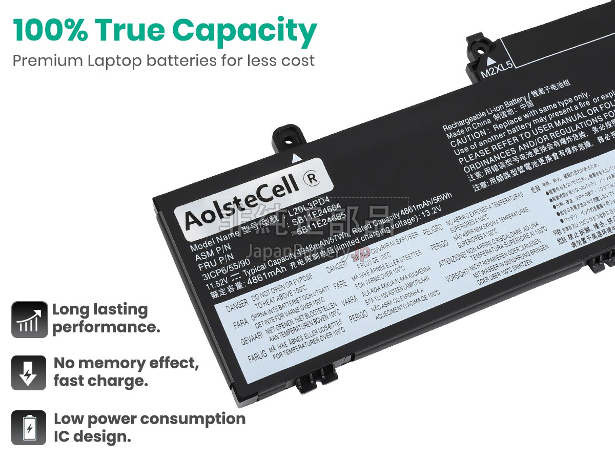 内蔵されたセルはノートパソコンのバッテリーの一番大切な部分です。Lenovo L20L3PD4ノートPCバッテリーはオリジナルレベルのA+セルセルで組み立てられ、安全性がより高く、駆動時間も寿命もより長いです。
