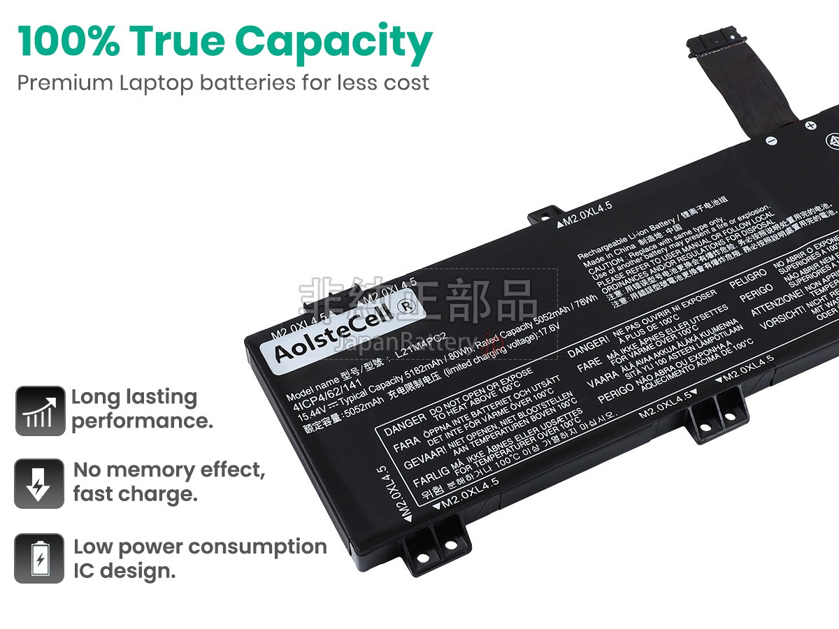 内蔵されたセルはノートパソコンのバッテリーの一番大切な部分です。Lenovo LEGION 5-15IAH7H-82RB00LKGEノートPCバッテリーはオリジナルレベルのA+セルセルで組み立てられ、安全性がより高く、駆動時間も寿命もより長いです。