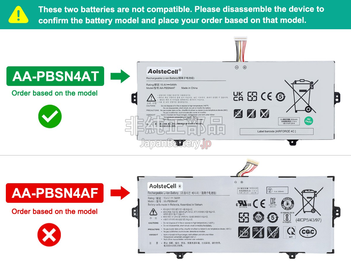 ご安心に購入するために、JapanBattery.jpはすべてのお客様に一流の製品とアフターケアを提供し、購入する前にいくつの問題を注意しております。1、自分に必要のはSamsung NP750XDA-KD2USバッテリーであること、過ちを防ぐため、ご注文時の型番を付記し、正しい電池を購入したかどうかを判断することができる。